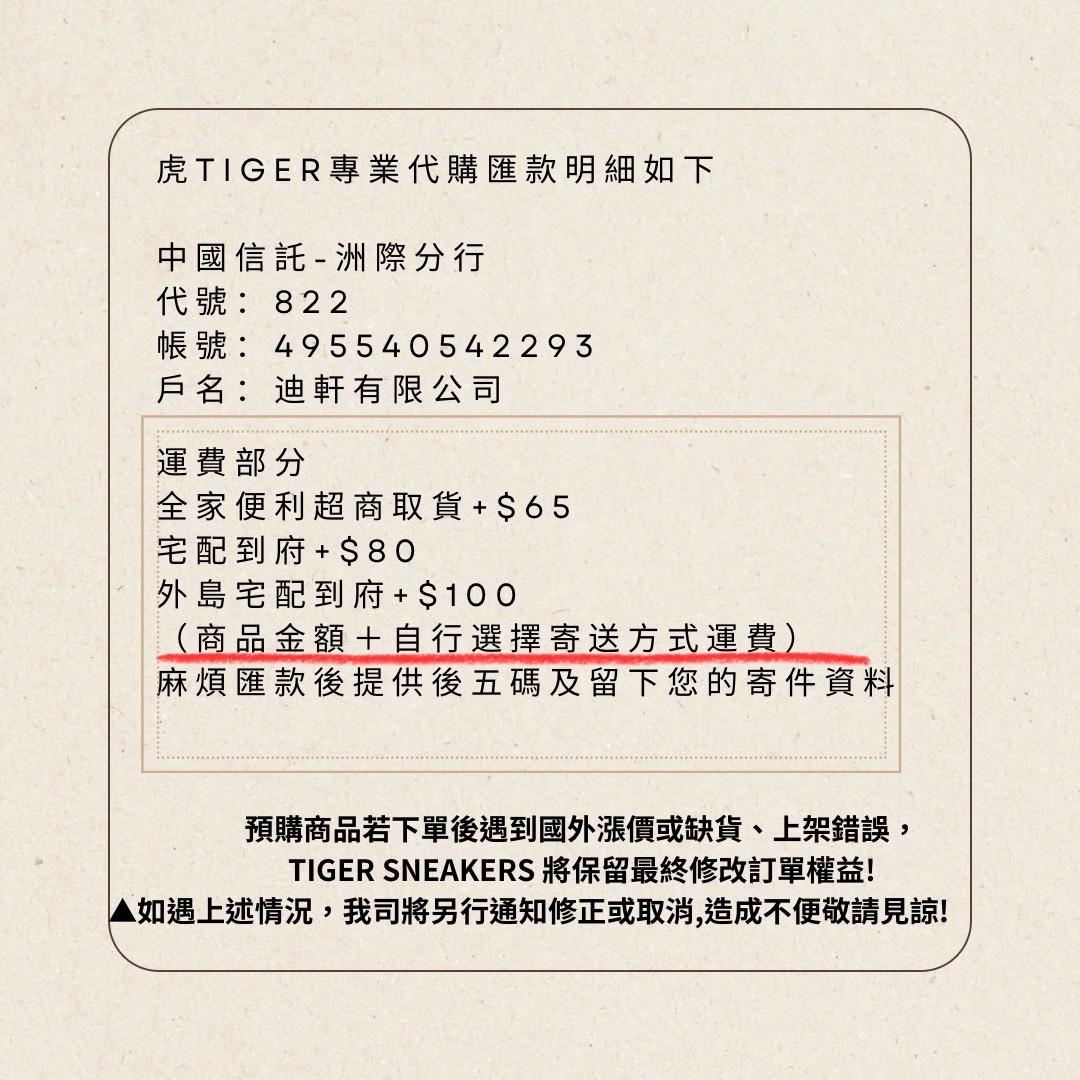 ▲賣場所有商品若下單後遇到國外漲價或缺貨、上架錯誤,TIGER SNEAKERS 將保留最終修改訂單權益!